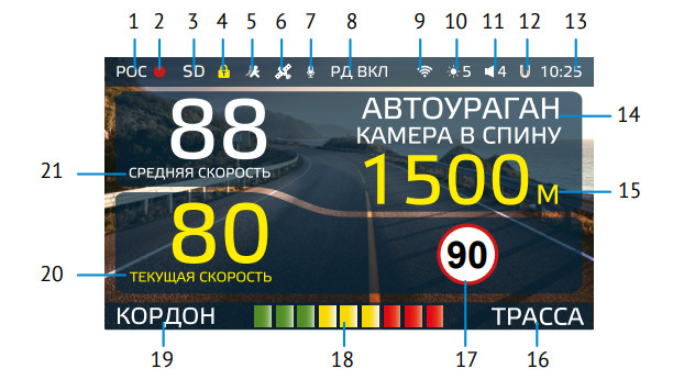 - Индикатор выбранного режима радар-детектора (Смарт, Ультра-К, Мегаполис, Тихий город, Город, Трасса, Турбо)