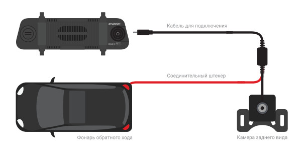 - Выносная задняя камера (в комплекте) снимает всё, что происходит позади автомобиля: парковку, попытки подрезать сзади или ДТП при движении задним ходом. Изображение с задней камеры выводится на экран автоматически при включении задней передачи.