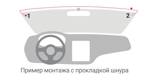 - Выберите подходящее место для установки на лобовом стекле — 1, 2 (оптимальное место для размещения: верхние или нижние углы лобового стекла). Убедитесь в правильности выбора места.