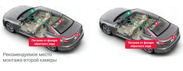 - Выберите место установки камеры заднего вида. Используйте рекомендуемые места — B или C.