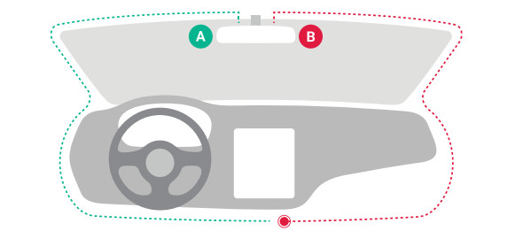 - Вы можете монтировать камеру на заднее стекло внутри автомобиля B при условии, если его конструкция позволяет это сделать. Также вы можете монтировать камеру снаружи — на задней части автомобиля, например над номерным знаком C, в комплекте есть саморезы.