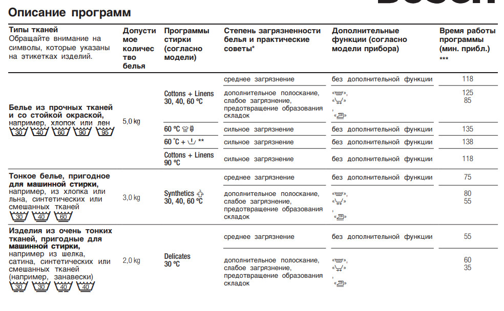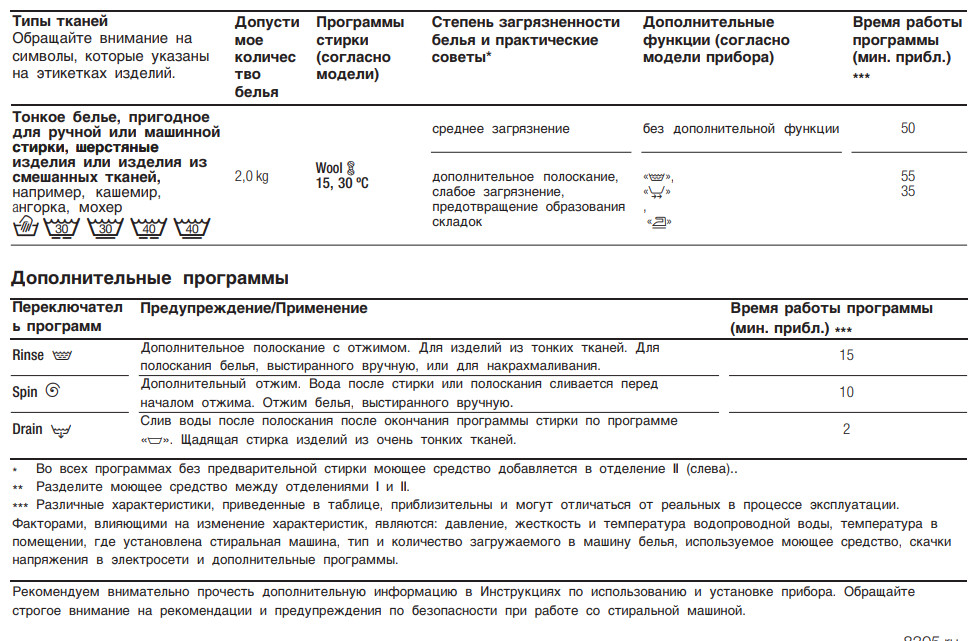 - Основные программы: хлопок, синтетика, деликатные ткани, шерсть, быстрая стирка