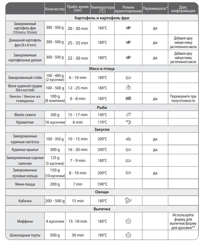 Примечание. Варианты времени приготовления представлены в качестве ориентира и могут изменяться в зависимости от сорта и количества картофеля. Размер, форма и марка других продуктов могут повлиять на конечный результат приготовления. Возможно, вам потребуется немного отрегулировать время приготовления.