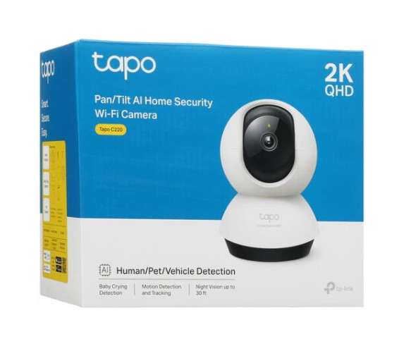TP-Link Tapo C220 — компактная умная поворотная Wi-Fi камера для дома с разрешением 4 Мп (2560×1440). Она обеспечивает полный обзор помещения за счёт поворота на 360° по горизонтали и 114° по вертикали, предлагает качественное ночное видение до 9 метров, интеллектуальное распознавание людей и движения с мгновенными уведомлениями, двустороннюю аудиосвязь, встроенную звуковую и световую сирену для отпугивания, запись на microSD до 512 ГБ без какой-либо подписки, а также удобное голосовое управление через Google Assistant, Amazon Alexa и другие сервисы. Установка проходит быстро, поддерживаются режим патрулирования и сохранение пресетов ракурсов. Отличный вариант для наблюдения за домом, детьми, питомцами или офисом — просто, надёжно и без лишних расходов.